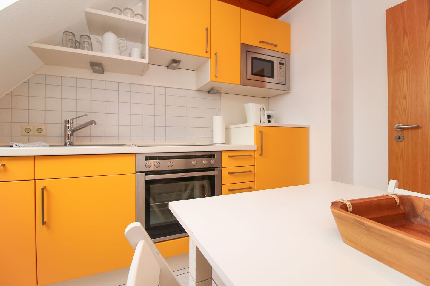 Der Wohnbereich ist mit einer gemütlichen Sofaecke, einem Sessel sowie TV ausgestattet und lädt zum Verweilen ein. Ein Esstisch bietet ausreichend Platz für gemeinsame Mahlzeiten. Die offene Küche ist umfangreich eingerichtet und enthält neben einem Ceran-Herd, einer Spülmaschine und einem großen Kühlschrank mit Gefrierfach auch Kleingeräte wie Toaster, Wasserkocher und Kaffeemaschine.