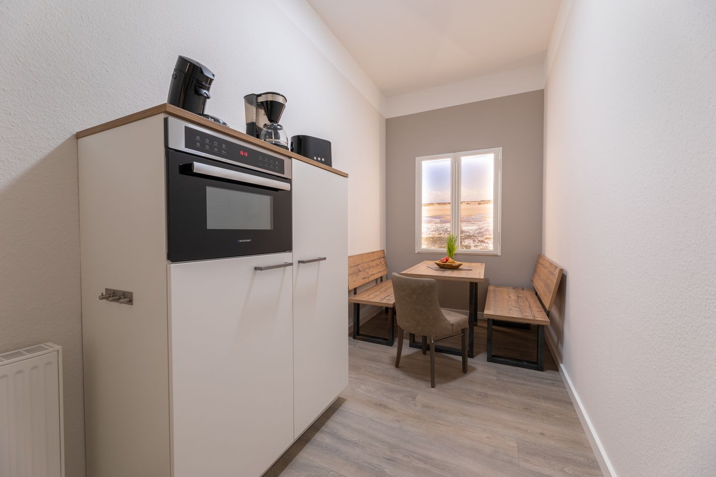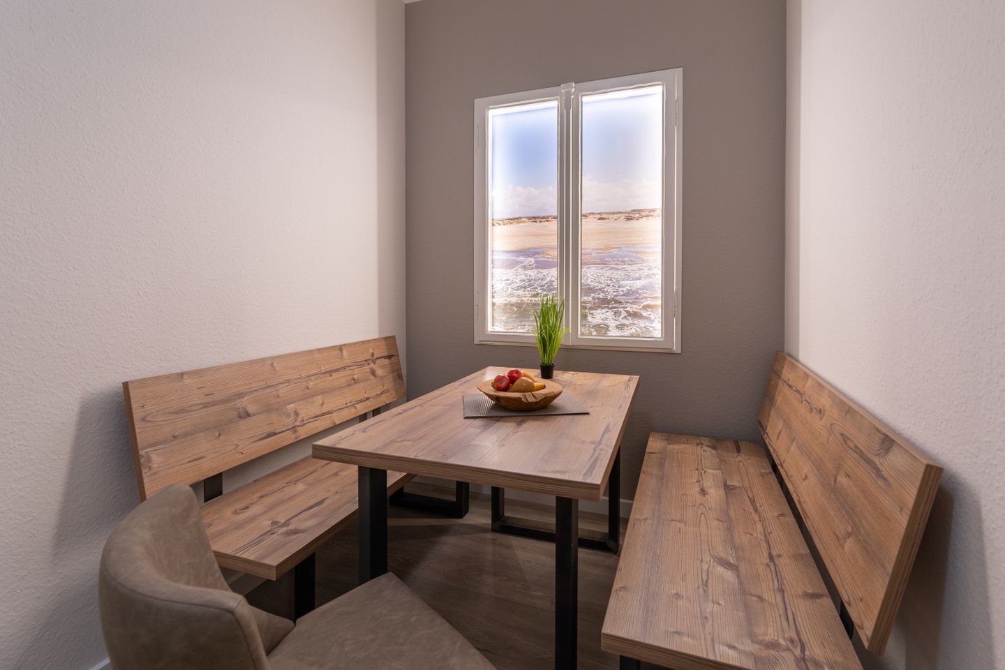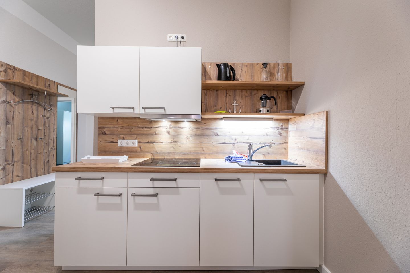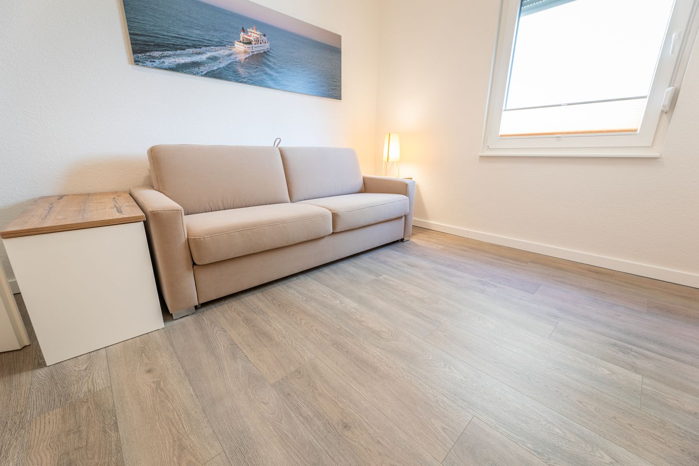 Kajüte 8 im Ferienhaus Inselanker erstrahlt seit der Renovierung 2021 im modernen maritimen Stil – hell, freundlich und gemütlich. Die 1-Zimmer-Wohnung auf 30 m² in der 1. Etage bietet Platz für 2 Personen. Der Wohn-/Schlafbereich überzeugt mit Sofa (als Schlafsofa 190×190 cm), Cocktailsessel und TV, während die offene, gut ausgestattete Küchenzeile zu gemeinsamen Mahlzeiten einlädt. Das Bad mit Dusche und WC ist innenliegend und modern eingerichtet. Ein Highlight ist das beleuchtete Holzfenster, das einen stimmungsvollen Blick auf die Insel bietet. Plissees und Außen-Rollo sorgen für Sichtschutz und Verdunkelung – ideal für einen entspannten Urlaub mit Sonne, Strand und echtem Norderneyer Urlaubsgefühl.
