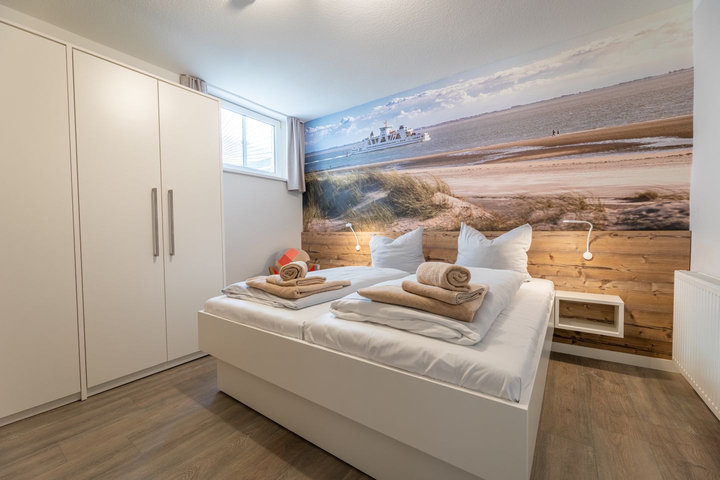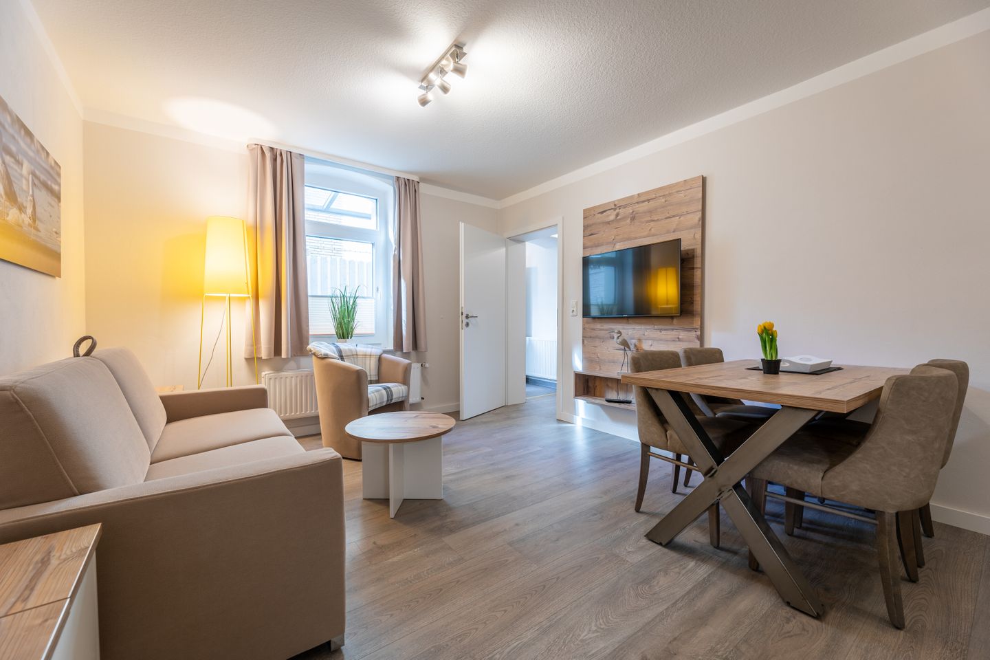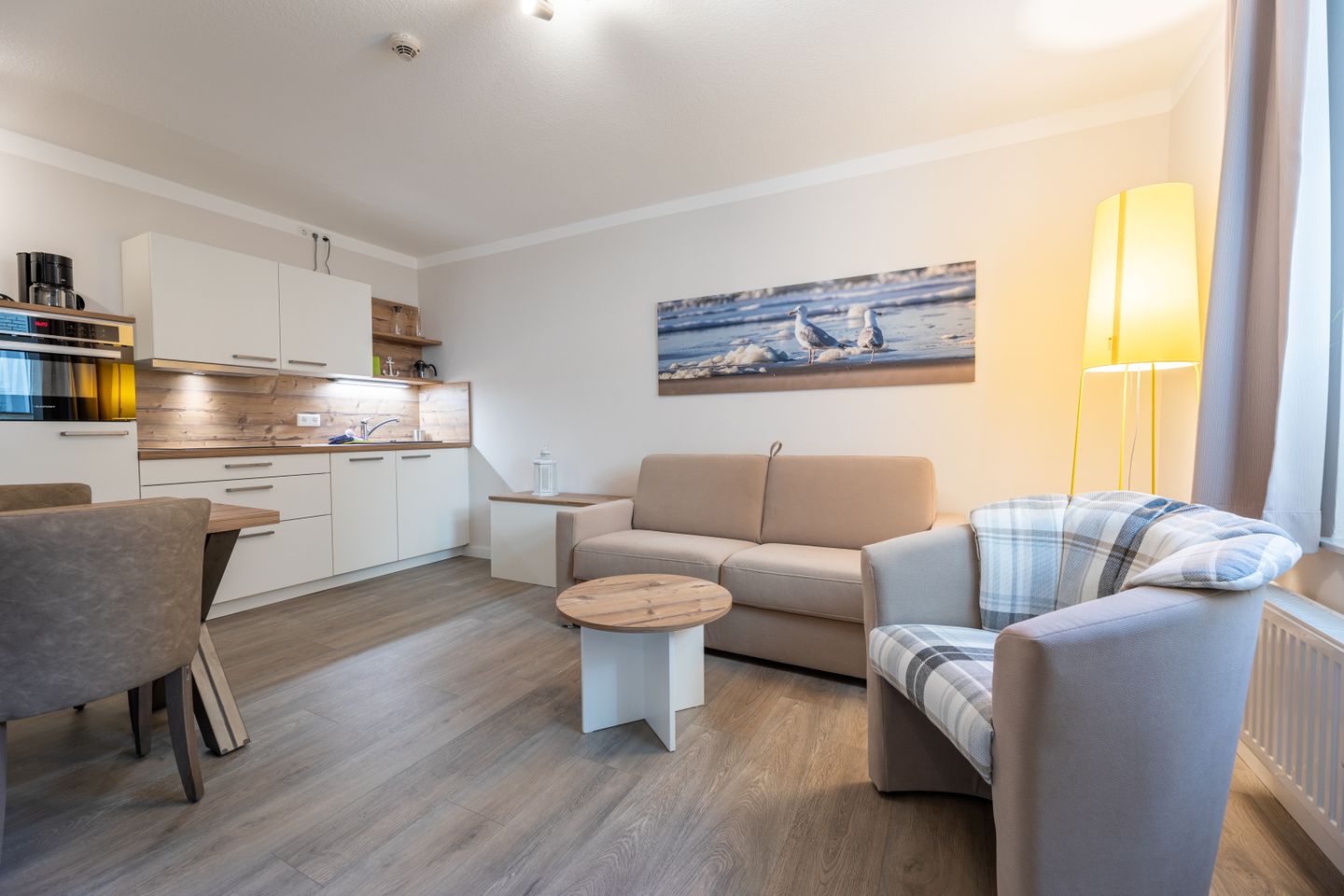 Kajüte 9 im Ferienhaus Inselanker erstrahlt seit der Renovierung 2021 im modernen maritimen Stil – hell, freundlich und gemütlich. Die Wohnung im Souterrain auf 41 m² bietet Platz für bis zu 4 Personen, auch mit Hund. Sie verfügt über ein Schlafzimmer mit Doppelbett (optional Babybett) und einen Wohnbereich mit Sofa (als Schlafsofa 170×190 cm), Cocktailsessel und TV. Die voll ausgestattete Küchenzeile mit Essplatz lädt zu gemeinsamen Mahlzeiten ein, das Bad mit Dusche/WC ist modern eingerichtet. Plissees und Übergardinen sorgen für Sichtschutz und Verdunkelung – ideal für Familien oder Freunde, die ein entspanntes Norderneyer Urlaubsgefühl genießen möchten.