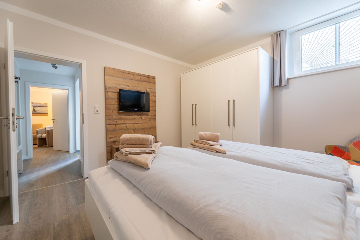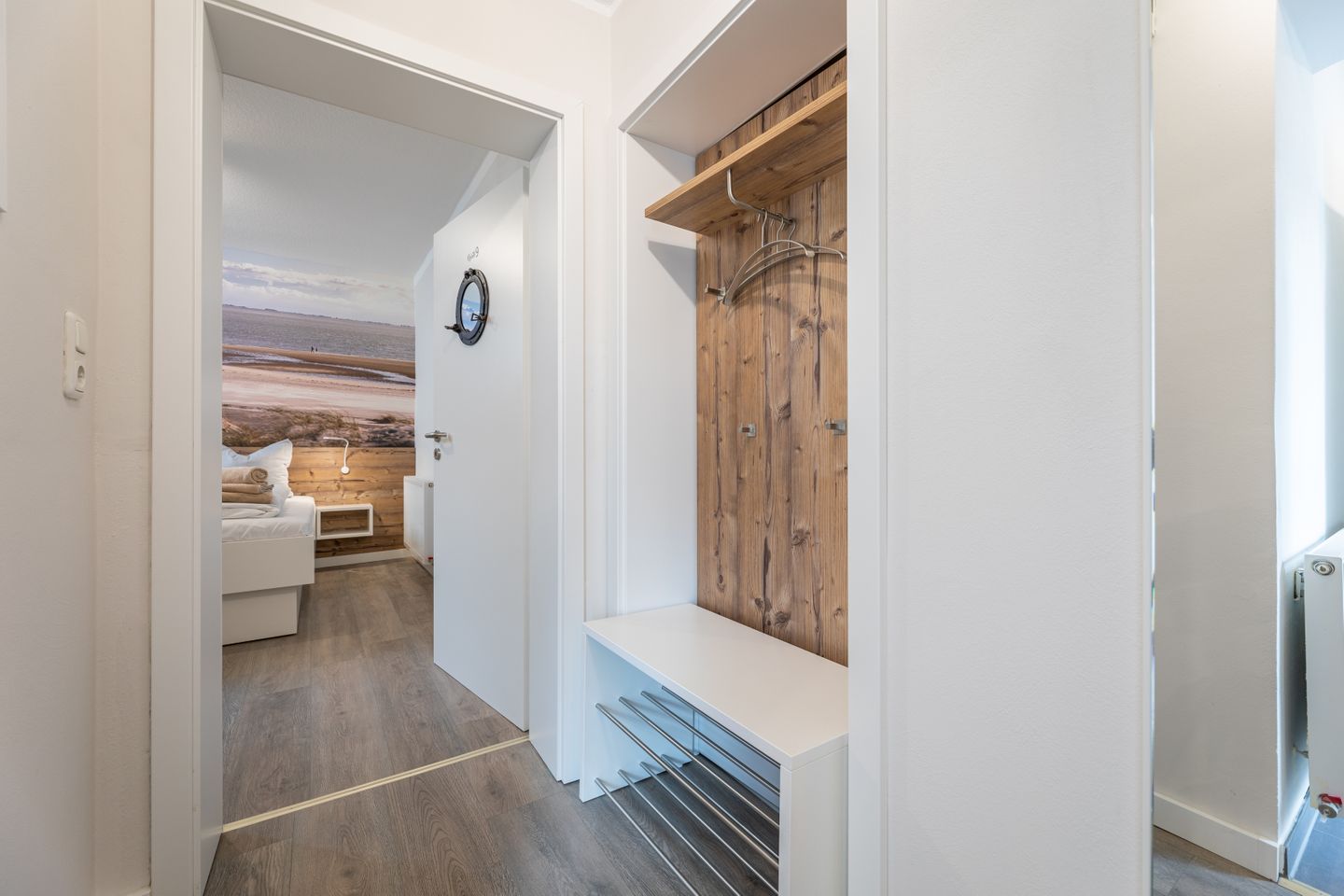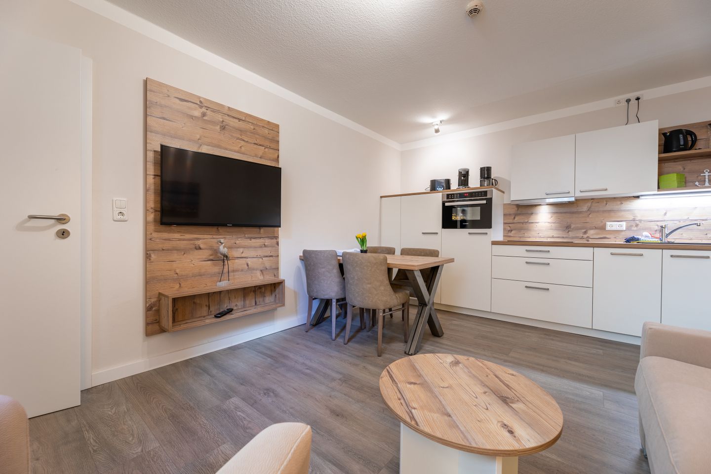 Kajüte 9 im Ferienhaus Inselanker erstrahlt seit der Renovierung 2021 im modernen maritimen Stil – hell, freundlich und gemütlich. Die Wohnung im Souterrain auf 41 m² bietet Platz für bis zu 4 Personen, auch mit Hund. Sie verfügt über ein Schlafzimmer mit Doppelbett (optional Babybett) und einen Wohnbereich mit Sofa (als Schlafsofa 170×190 cm), Cocktailsessel und TV. Die voll ausgestattete Küchenzeile mit Essplatz lädt zu gemeinsamen Mahlzeiten ein, das Bad mit Dusche/WC ist modern eingerichtet. Plissees und Übergardinen sorgen für Sichtschutz und Verdunkelung – ideal für Familien oder Freunde, die ein entspanntes Norderneyer Urlaubsgefühl genießen möchten.