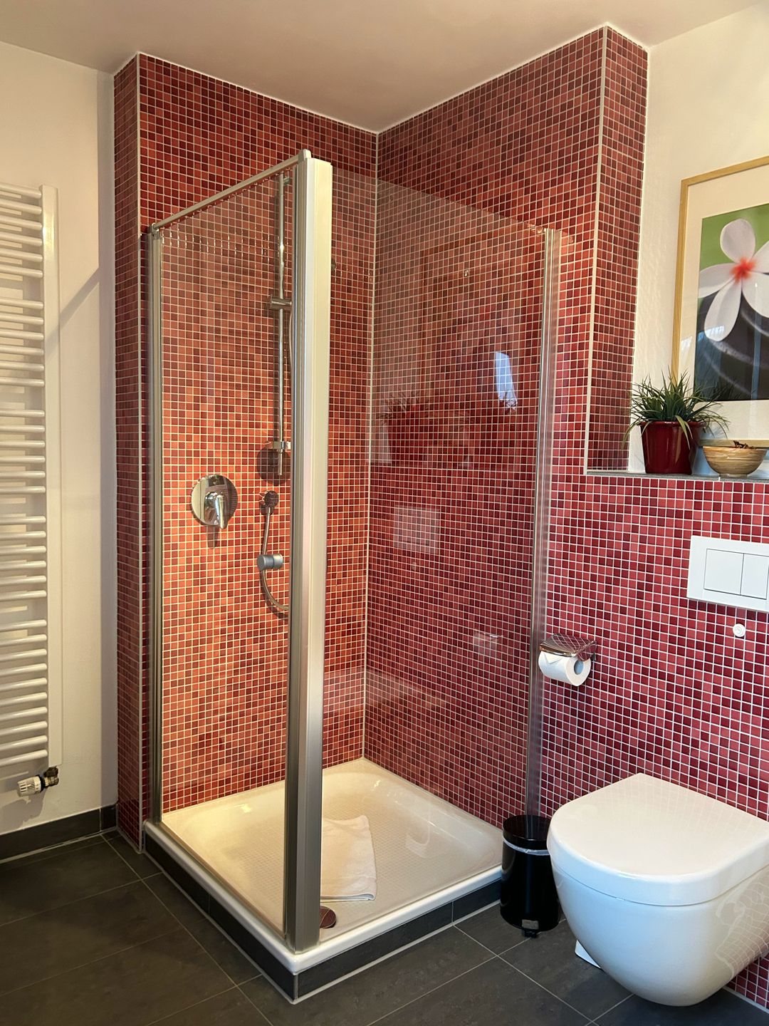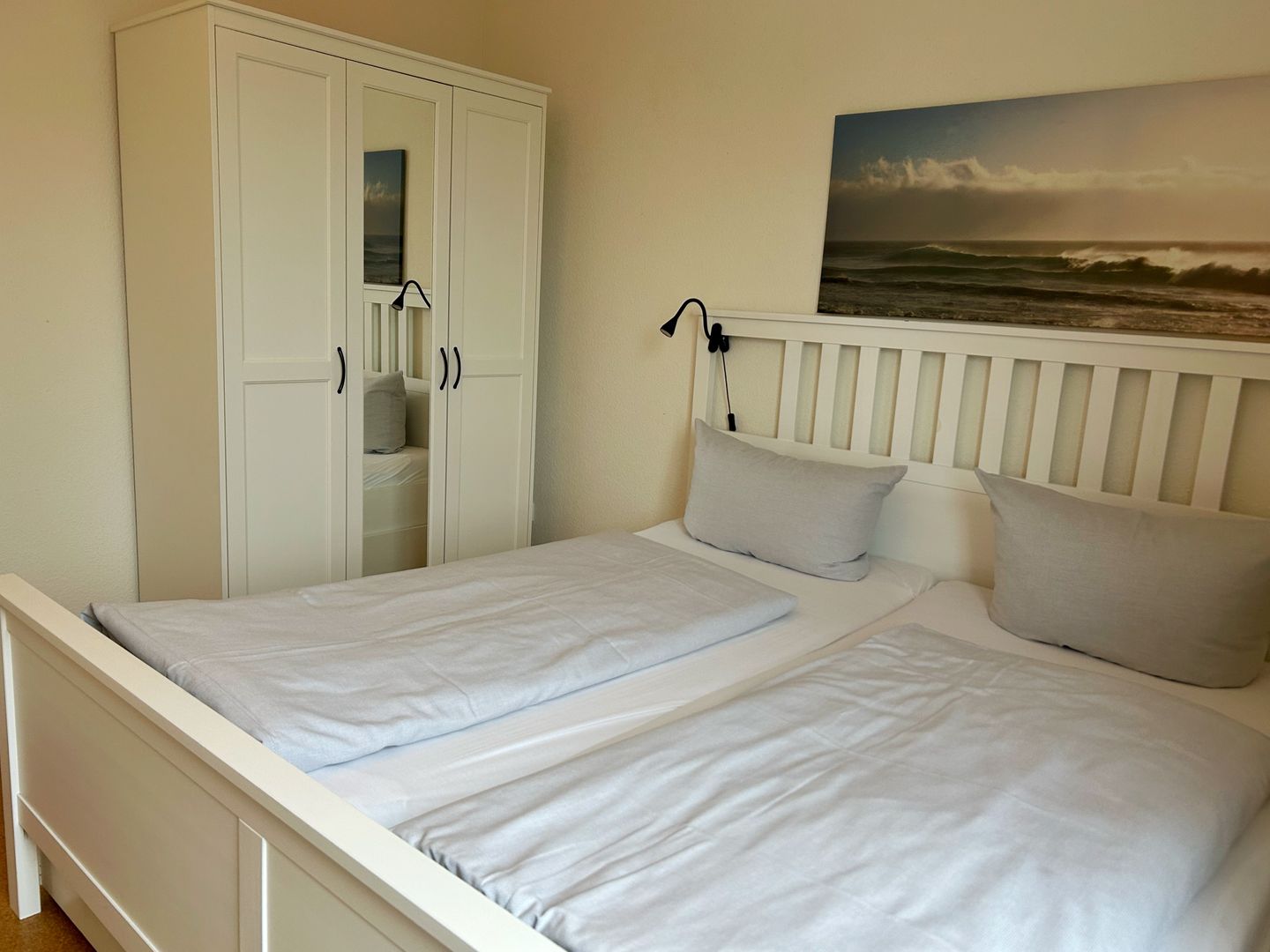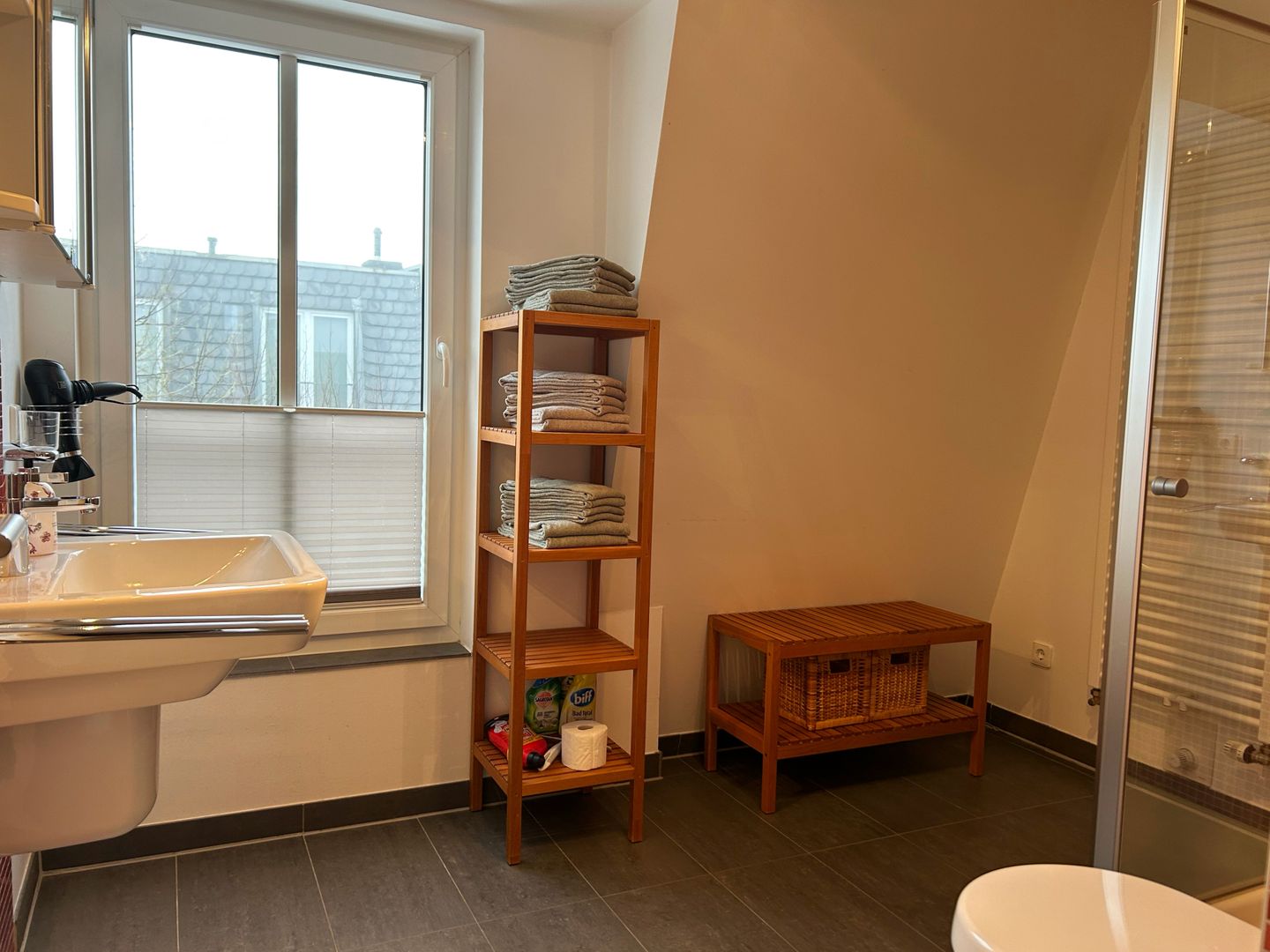 In der 1. Etage / im Dachgeschoss befinden sich drei gemütliche Schlafzimmer, jeweils mit einem Doppelbett, sowie ein modernes Badezimmer mit Dusche und WC.