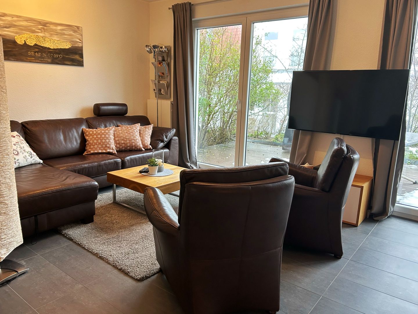 Im Erdgeschoss erwartet Sie ein großzügiger, heller Wohnbereich mit TV, der zum Verweilen einlädt. Die offene Küche ist vollständig ausgestattet mit Backofen und Geschirrspülmaschine und schließt direkt an den großen Essbereich an – perfekt für gemeinsame Mahlzeiten. Zusätzlich stehen ein Gäste-WC sowie der Zugang zur Terrasse zur Verfügung, auf der Sie schöne Stunden im Freien genießen können.