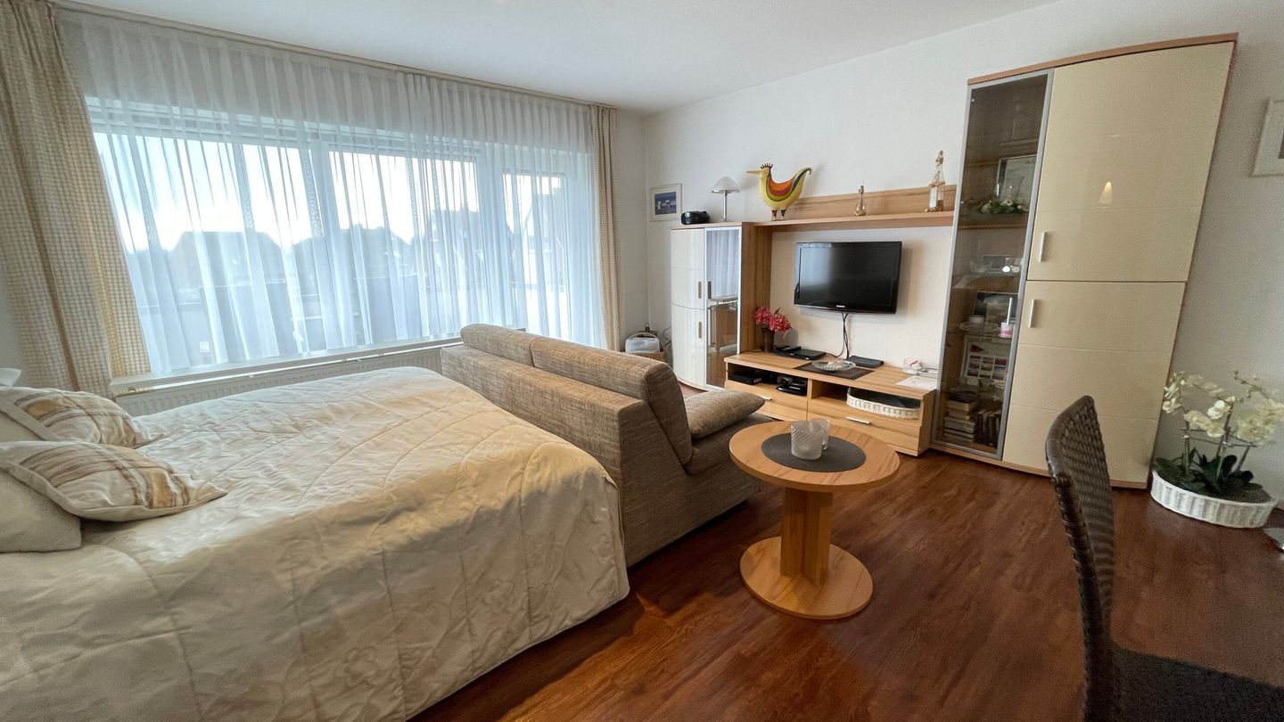 Das helle, großzügige 1-Raum-Apartment im 1. Stock zzgl. Hochparterre verfügt über einen Wohn-/Schlafraum mit gemütlichem Doppelbett, Küchenzeile, Essbereich sowie Badezimmer mit Dusche/ WC. Als Highlight bietet die Wohnung einen schönen Südbalkon, zwei eigene Fahrräder sowie einen PKW-Stellplatz hinter dem Haus. Im Keller stehen Münzwaschmaschine und Trockner zur Mitbenutzung bereit.